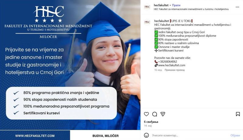 Upisni rok za master primijenjene studije Internacionalnog menadžmenta u gastronomiji i hotelijerstvu traje i dalje - sve do 26. septembra 2025.