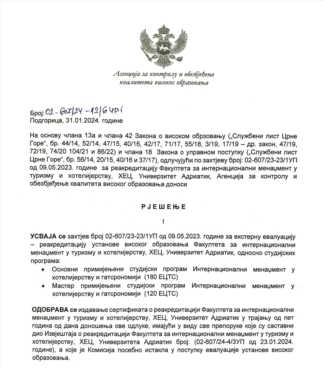 Agencija za kontrolu i obezbjeđenje kvaliteta u visokom obrazovanju Crne Gore izdala je HEC Fakultetu rješenje o reakreditaciji primijenjenih osnovnih i master studija Internacionalnog menadžmenta u hotelijerstvu i gastronomiji na period od 5 godina, odnosno do 23.01.2029. godine.